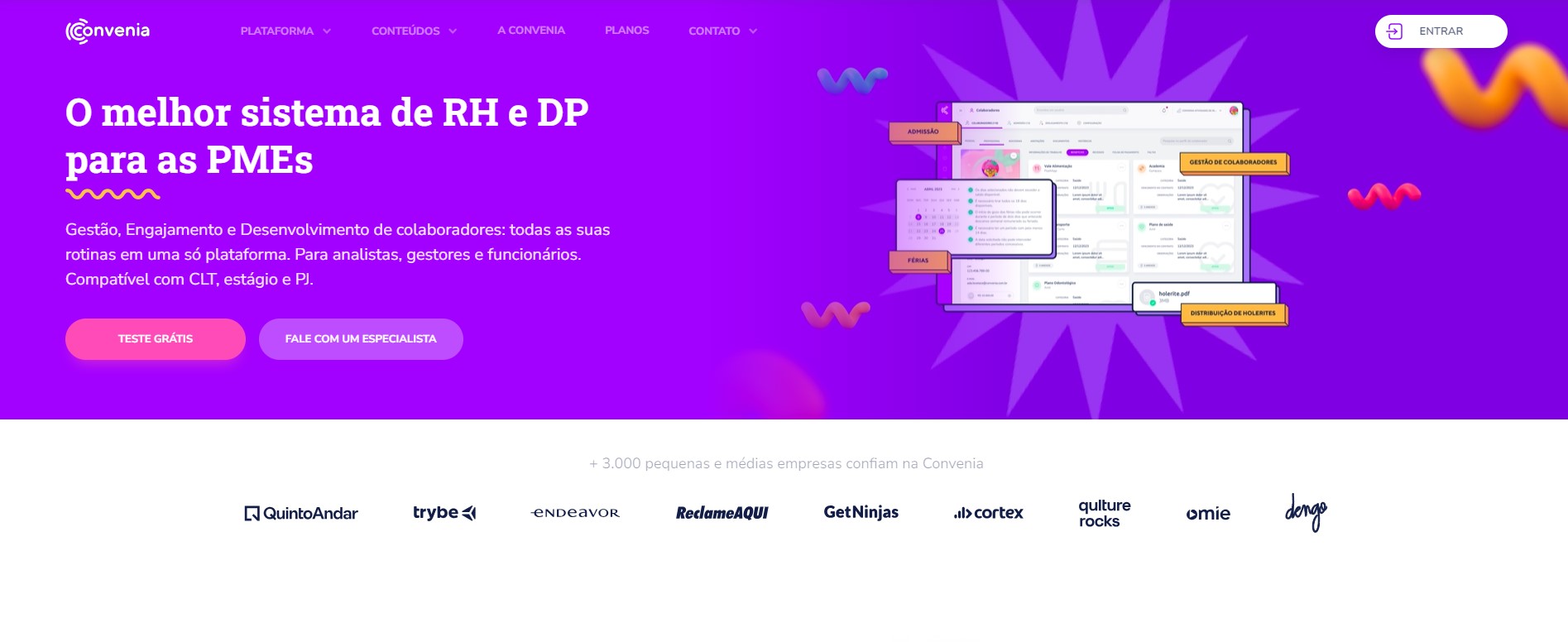 A Convenia surge como uma plataforma para integrar o RH de forma ágil e completa. Por lá, é possível centralizar as demandas do Departamento Pessoal, com avaliações de desempenho, comunicação interna, Enps, planos de desenvolvimento individual, reuniões 1:1, entre outras funcionalidades.