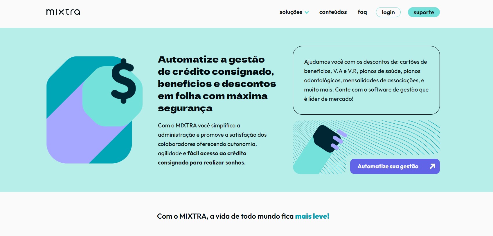 Ainda, o MIXTRA também tem utilidade para o colaborador, que pode consultar sua margem consignável e fazer simulação de novos empréstimos. Com ótimas taxas do mercado e sem precisar ir ao banco, fica mais fácil gerir a vida financeira.